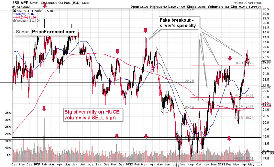 Silver price breakouts are not to be taken at their face value as well. The white precious metal is known for its tendency to break out above its previous highs, exciting those who are new to the silver market and/or investing/trading in general, and then sliding profoundly to the said investors’ / traders’ surprise (and disappointment.