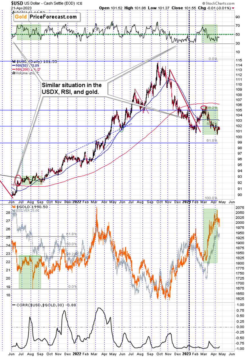 And since the correlation between gold and the USD Index is so strongly negative (you can see it at the bottom of the above chart) and gold and the USDX have been indeed moving in the opposite directions for more than a year now, the bullish outlook for the USD Index is very bearish for the precious metals market.
