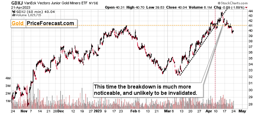 While silver remained above its previous 2023 high, the GDXJ ETF – proxy for junior mining stocks – moved decisively lower in a sharp manner. It managed to close the week only a few cents above the $40 level. It’s not important that it closed above $40; what is important is that it closed the week well below the January 2023 highs.