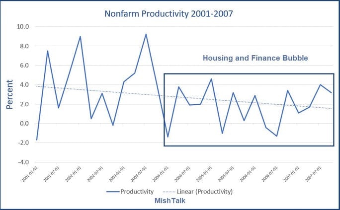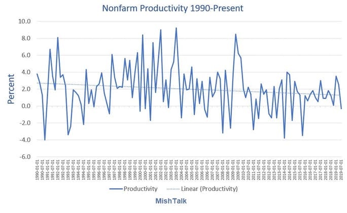 In the above and all the following charts, I let Excel plot the trendline. The chart shows declining productivity, but it's horribly misleading. Let's investigate other timeframes to understand why.
