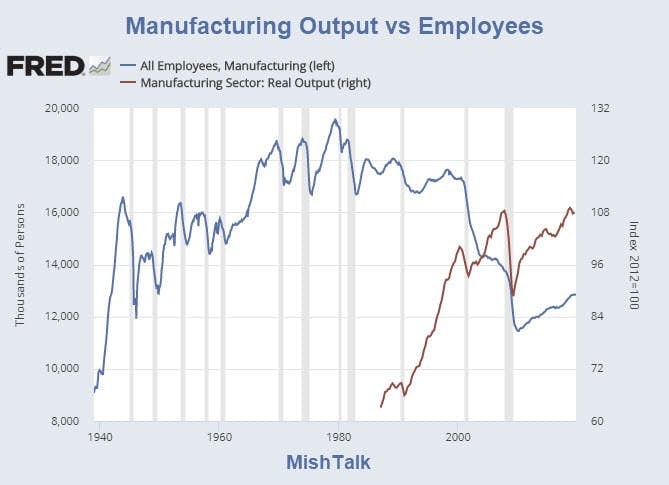 From 1990 until 2008 manufacturing output per employee skyrocketed. Both plunged in the Great Recession and the trends are now positive but output per employee has slowed to a crawl as the number of manufacturing employees has been on the rise.