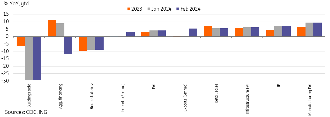 As expected, infrastructure investment continued to outperform the headline fixed asset investment (FAI) growth in the first two months of the year, up 6.3% YoY ytd. We think that infrastructure investment will be a focus for fiscal policy support this year, as achieving the 5% GDP growth target will be challenging without ramping up investment, and as infrastructure remains an area where there can be productive investment. Manufacturing FAI also saw strong growth at the start of the year, up 9.4% YoY ytd, the highest level since October 2022.