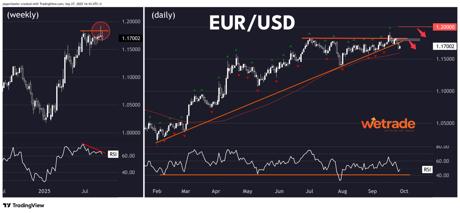 A broken long term uptrend line as well as RSI shifting to a bearish regime holding under the 65 level suggests the uptrend has begun to reverse. A supply zone around 1.18 could offer a sell signal, as could the 1.20 figure if the market puts in one more ‘failed’ higher high.