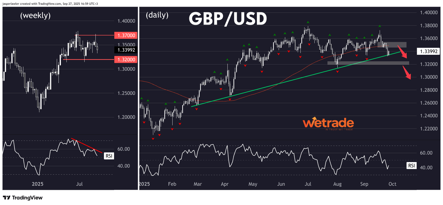 RSI already reached oversold levels in early August and has failed to get overbought since, while price has failed several attempts to break and hold above 1.36. A bounce towards the supply zone around 1.35 could present a sell trigger while a break of the uptrend line would confirm the bearish reversal.