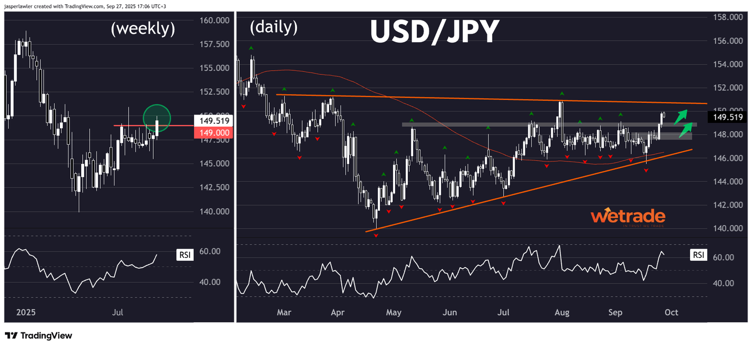 Price has held above its 100-day MA and support at the 146 level - hitting 150 last week. Another pullback to 149 or 148 could offer a buy trigger with a break of the long term triangle pattern’s upper trendline confirming the bullish reversal.