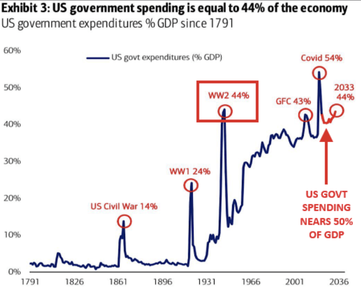 Beyond the Fed, the U.S. fiscal position is adding another layer of strain. Federal debt has expanded by $1 trillion in just 48 days, equivalent to $21 billion per day. The national total now stands near $38 trillion, with government spending consuming 44% of GDP - levels previously seen only in wartime or crisis conditions.