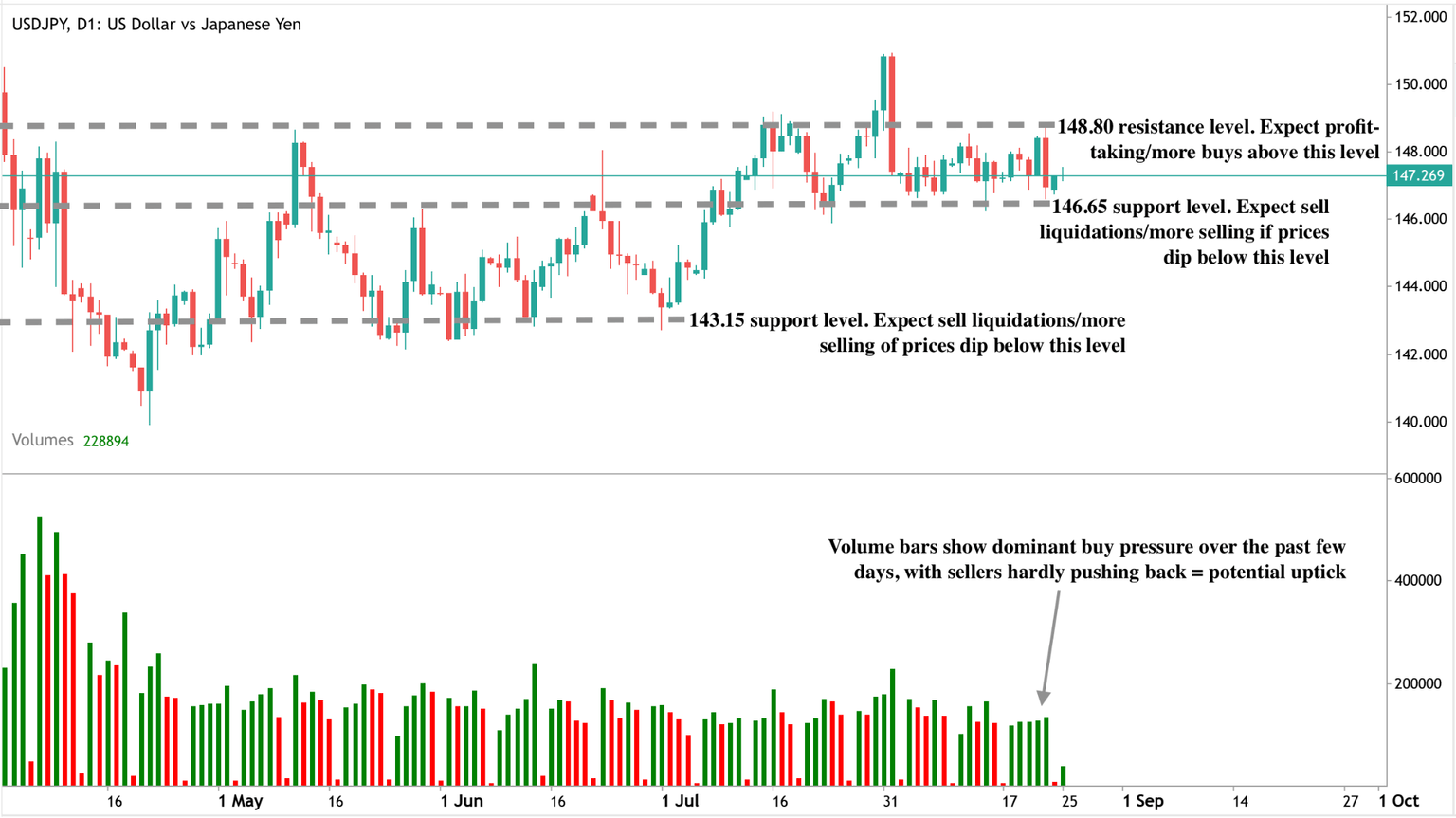 At the time of writing, the pair is trading close to a support level, hinting at a potential price uptick. The volume bars showing dominant buy pressure with little pushback from sellers add to the bullish narrative. Should a price uptick materialise, prices could find resistance at the $148.89 price level. Conversely, if we see a dip, prices could find support at the $146.65 and $143.15 support levels.
