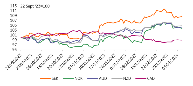 As mentioned above, we see the longer-term FX impact of the end of Riksbank’s hedging operations emerging through the krona’s relative performance to other high-beta currencies. SEK’s closest peer, Norway's krone, looks more attractive in 2024, in our view.