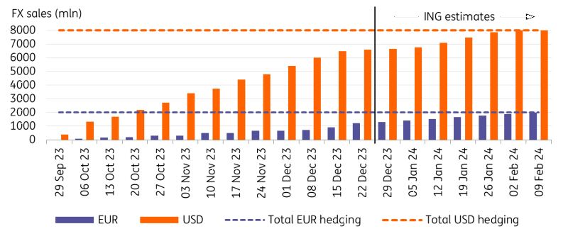 We estimate that the Riksbank’s FX reserve hedging programme will end by early February. As shown in the chart below, the Riksbank has so far reported FX sales worth USD 6,600m and EUR 1,212m as of 22 December. The size of the programme is USD 8bn and EUR 2bn.