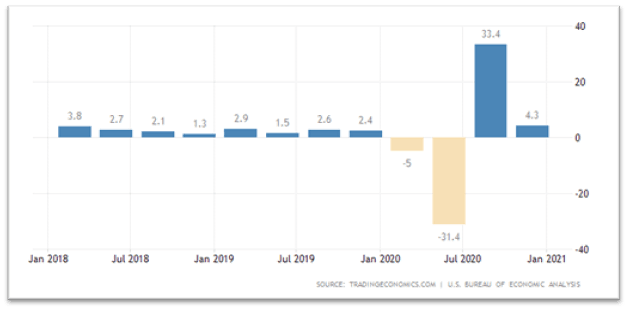 The quarterly US GDP Growth Rate is forecasted to come in at ~6.4%, which is a couple of percentage points higher than last quarter. Several rounds of stimulus checks, record planned infrastructure spending, and a successful vaccination program are helping the country lift economic performance. The Thursday GDP report should go some way in mitigating the fears of the proposed hike in the rate aimed at capital gains that swayed the stock market at the end of last week.