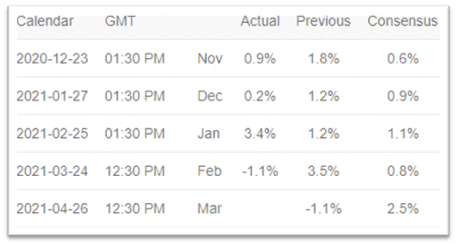 The consensus is that consumer confidence in Japan is pulling back slightly to 35.5 in April, from 36.1 in March. The downgrade reflects the new wave of Covid infections across Japan, resulting in recent government-imposed lockdowns and the potential postponement of the Tokyo Olympics. For context, the consumer confidence value for the past ten years has primarily floated in the 40 to 45 range.