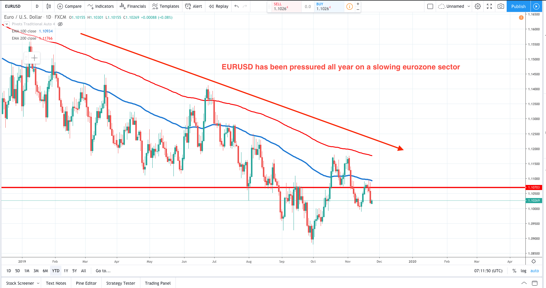 As we got the news that eurozone PMI’s decreased in November from 50.6 to 50.3 the spillover impact from the manufacturing sector to the service sector is at the heart of the decline. With still no confirmation of a phase 1 US-China trade deal risks to the eurozone remain tilted to the downside. Christine Lagarde’s first policy speech passed without any major impact. Christine Lagarde stated that: