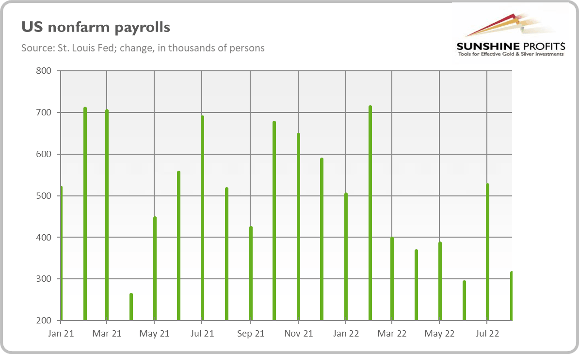 It seems to be, but it’s not! After all, as one can see in the chart below, the U.S. economy created 315,000 jobs last month, roughly in line with expectations, although less than 526,000 jobs added in July. Notable job gains occurred in professional and business services, health care, and retail trade.
