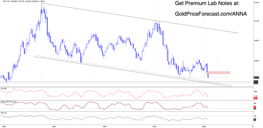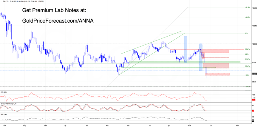 From today’s perspective, we see that bears once again had zero trouble delivering on our bearish scenario. The USD Index was pushed to its lowest level since February 2022, printing a fresh multi-year low at 95.44.