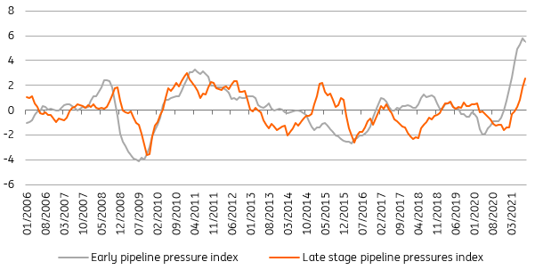 The impact on inflation is evident. Pipeline pressures for goods inflation have mounted to historic highs and have started to translate into higher consumer prices. The extent to which this will ultimately be priced through depends not only on higher input costs, but also on whether businesses prefer to squeeze margins to maintain volumes. The latter is less of an option the longer the disruptions continue, which means that we expect goods inflation to further increase over the coming months and to remain elevated throughout the first half of the year as pipeline pressures remain fierce. Drawing on Koester et al. (ECB bulletin 5/2021), we have created two indices that show underlying trends in early and late pipeline pressures for non-energy industrial goods inflation in the eurozone. The chart below shows that early pipeline pressures are just off historic highs, but that late pipeline pressures are only getting close to record readings. This delay suggests that elevated goods inflation is still to be expected for the months ahead.