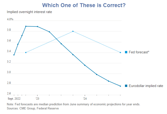 The Eurodollar curve implies four quarter-point cuts are on the way starting in 2023. The Fed believes otherwise. Let's discuss stock market implications.