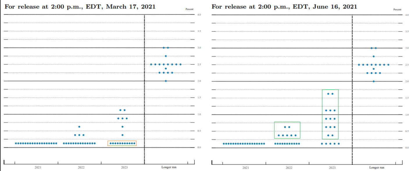 In the press conference, Fed Chair Powell recognised that “inflation could turn out to be higher and more persistent than we expect.” This is a nod to the recent strong run of CPI data that has come out. Some in the Fed are clearly concerned that inflation may not be transitory. However, although the inflation projections for this year for Core PCE rose to 3.0% from 2.2% the 2022 forecast was only revised slightly higher to 2.1% and the 2023 forecast remained unchanged. This means the core Fed message is that the majority still expect inflation to be transitory.