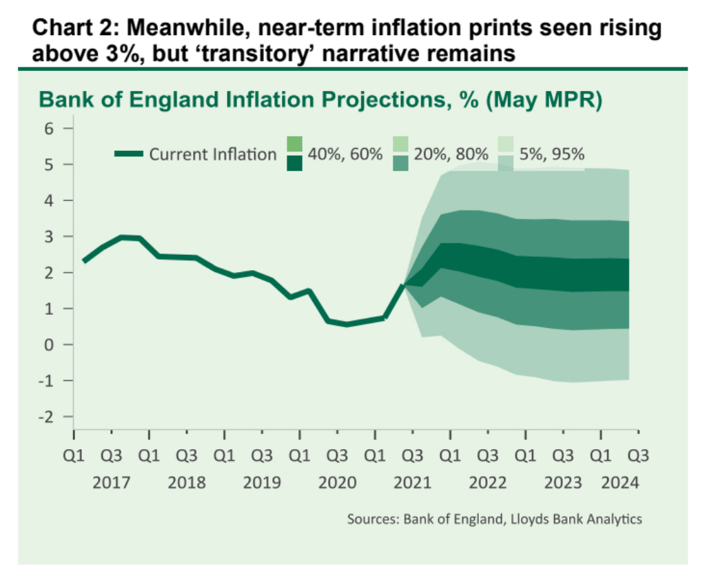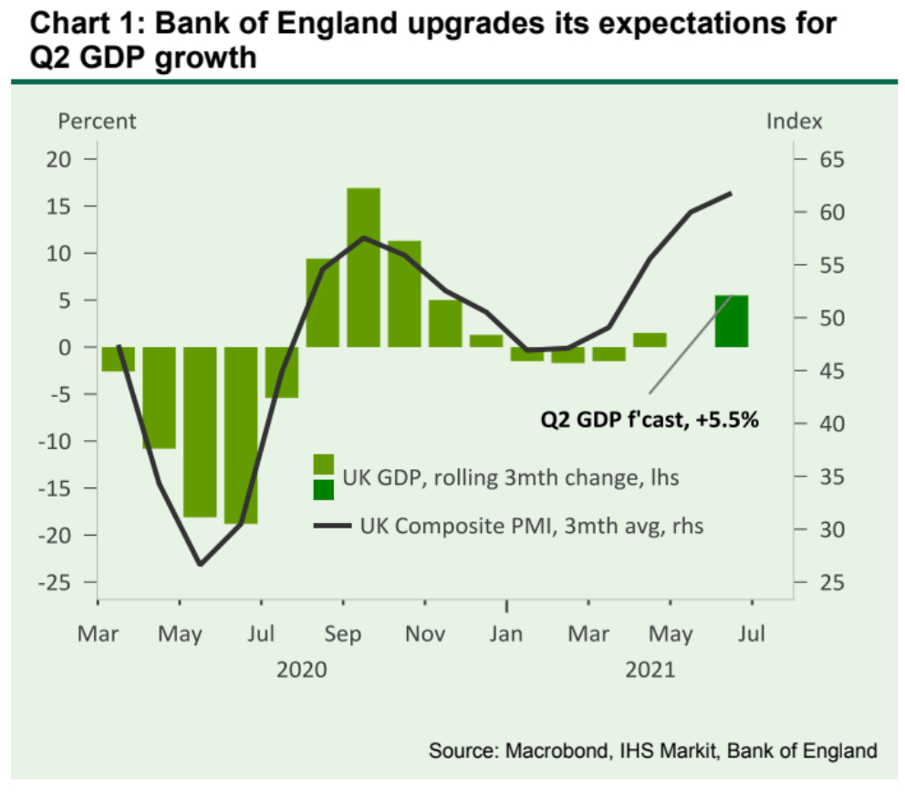 Growth expectations were revised higher by 1.5% with a strong recovery noted in the consumer-facing services for which restrictions were loosened in April. The hot housing market, which could have had the BoE act to contain, was merely seen as ‘strong’. So, no worries there from the BoE.