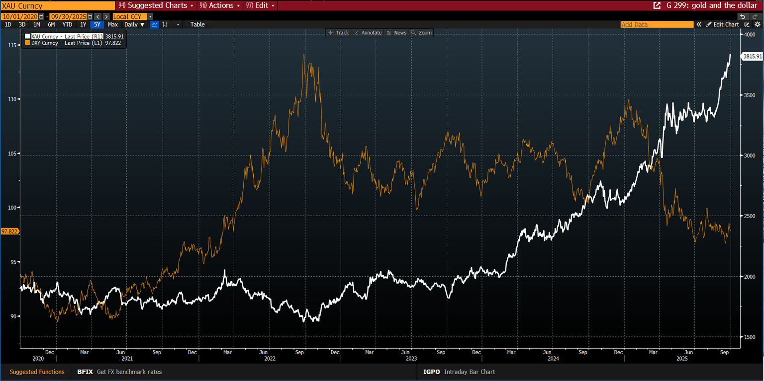 Chart 1: Gold and the US Dollar, 5-year chart. The inverse correlation has become notable since the start of this year.