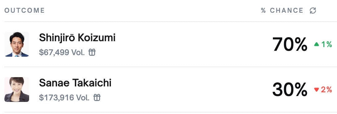 And politics, in Japan, will soon be center stage. On October 4 the LDP decides its next leader, and the race has narrowed to a two-horse duel between Shinjiro Koizumi and Sanae Takaichi. Every trader knows the outcome shapes the BoJ’s October 30 meeting as much as any inflation print. Koizumi has momentum: a Jiji poll put him narrowly ahead at 23.8% against Takaichi’s 21%, while Kyodo reversed the order but showed the gap tight. More importantly, among party members, Koizumi polls stronger when the sample is confined to LDP loyalists. Add the crucial endorsement from former PM Suga, who carries sway with the Ishin party, and you have the makings of a coalition that promises stability and reform. Betting markets see it too: Polymarket assigns roughly a 70% probability to Koizumi’s victory. Markets don’t just listen to polls; they price odds, and those odds say the yen is one election away from regaining its spine.