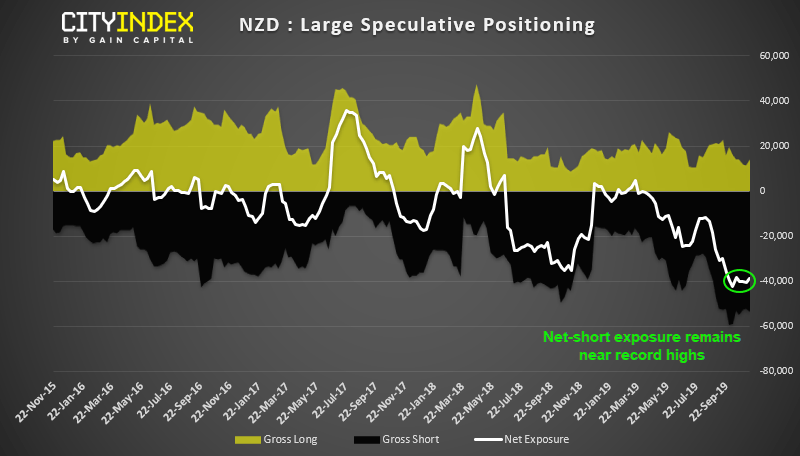 Net-short exposure on NZD futures remains near a historical extreme.