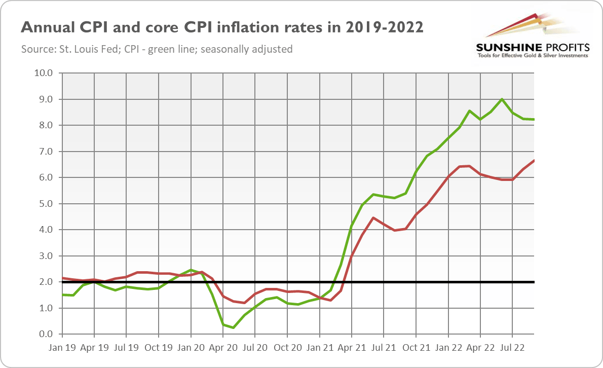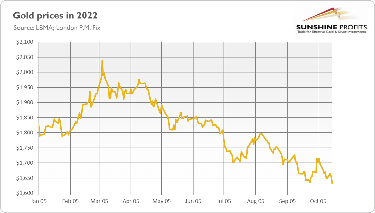 The problem is that as long as the Fed continues to raise interest rates, gold could continue to suffer. This week, Minneapolis Fed President Neel Kashkari said that “the Fed can’t pause its campaign of monetary policy tightening once its benchmark interest rate reaches 4.5% to 4.75% if ‘underlying’ inflation is still accelerating.” Traders are betting on another 75-basis points not only in November, but in December as well. It means that gold has, unfortunately, further room to go down this year.