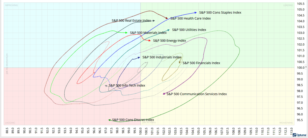 One recent tool that many technicians have adopted is called Relative Rotation Graphs (RRG graphs) for short. This visual representation of momentum and strength in a security compared to a benchmark is a valuable tool for portfolio positioning. Invented by Julius de Kempenaer, RRGs combine two indicators of relative momentum and strength. JDK RS-Momentum measures the speed of a securities movement vs. the benchmark, while JDK Relative Strength-Ratio indicates its outperformance compared to it. By comparing these two indicators against a benchmark, we can observe the security’s rotation from higher momentum and outperformance to lower momentum and underperformance. The four quadrants of the RRG graph—Improving, Leading, Weakening, and Lagging—indicate the security’s phase relative to the benchmark. These quadrants can be utilized in portfolio positioning to identify potential opportunities within a market.