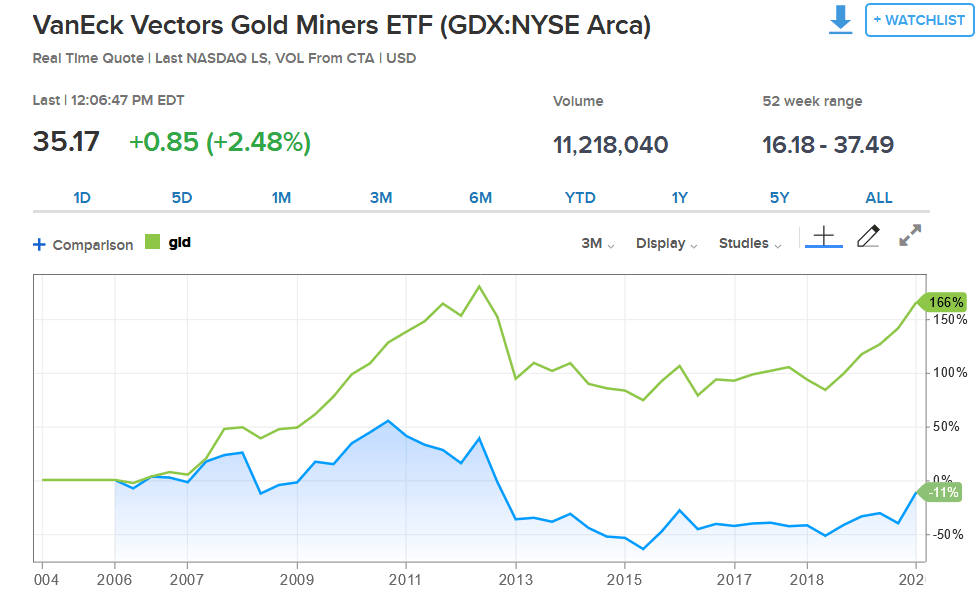 However, when bonds yields fall in the context of rising inflation, gold can really boost your overall performance. Just take a look at the Gold Miners Index (GDX) shown in blue vs. the Physical Metal (GLD) shown in green in the chart below.