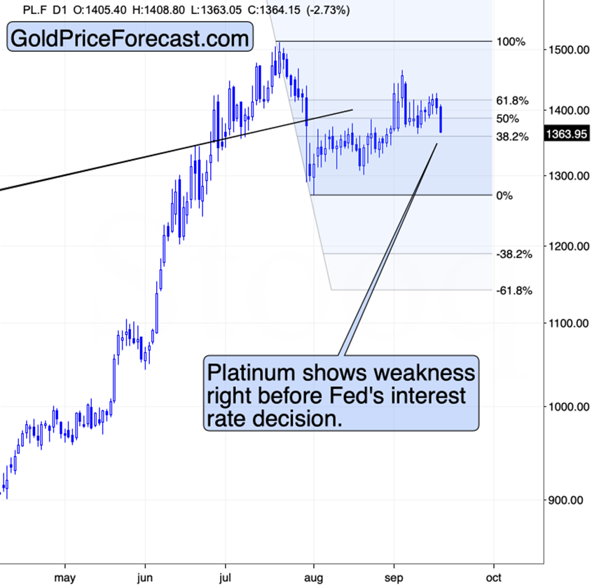 Platinum is down significantly as well. Platinum’s final attempt to rally back above the 61.8% Fibonacci retracement level failed and this might have marked the start of platinum’s big decline. Just like it’s been the case in the past.