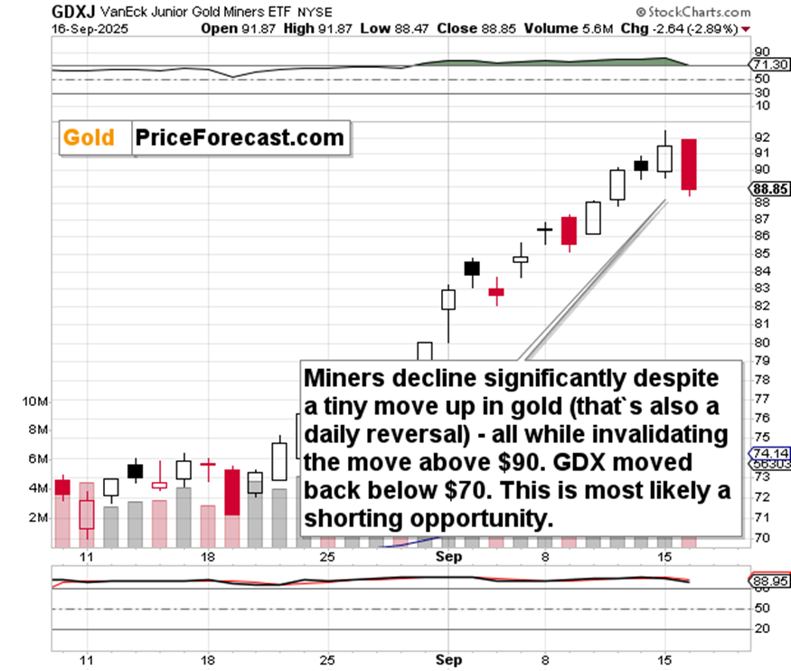 In a single day, the GDXJ erased the few previous days’ gains and it invalidated its move above $90 (GDX moved back below $70 at the same time). The ETF was down by almost 3% yesterday and it’s down by over 1% in today’s pre-market trading.