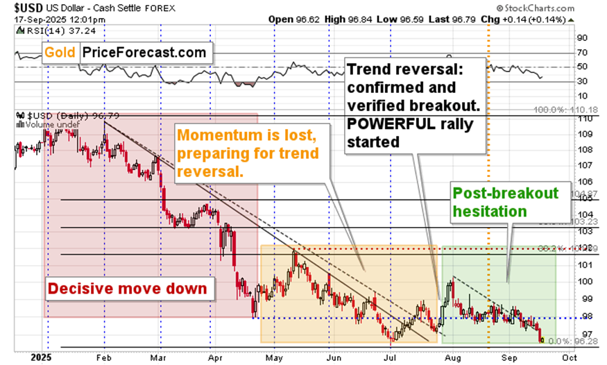 We have the USD Index that just moved to its early low and is starting to move back up. Let me write that again: the USD is refusing to move to new lows despite the change in Fed’s approach and focus on cutting rates and despite Fed’s independence being seriously questioned and doubted.