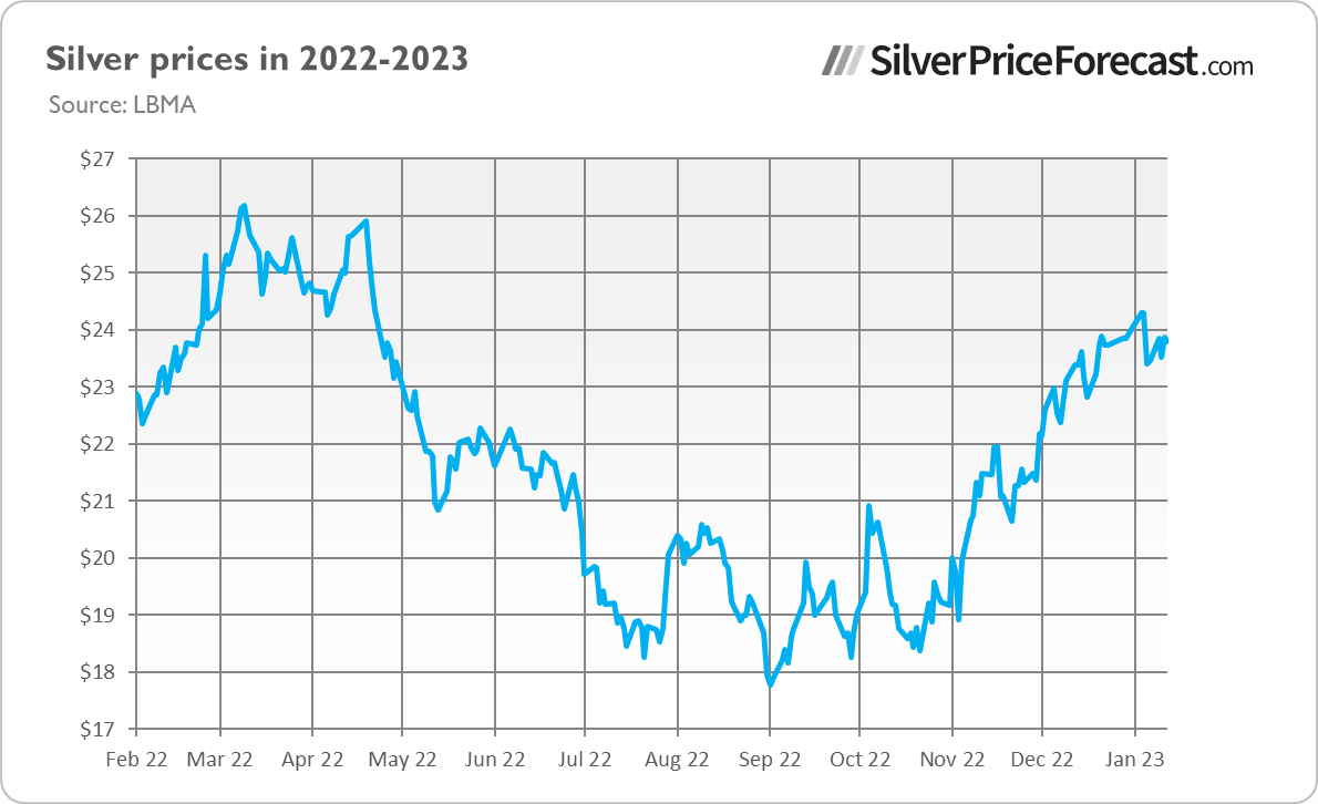 What does it all mean for the silver (and gold) outlook for 2023? Well, the release of the report sent silver prices up initially. They jumped above $24 for a while but corrected later to about $23.6 - only to rally again. Hence, they continued to be traded just below $24, as the chart below shows (courtesy of silverpiceforecast.com).