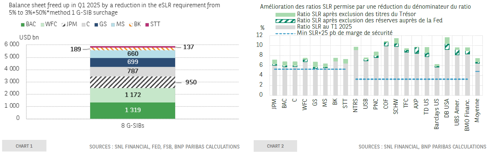 A first option would be to reduce the enhanced SLR requirements (eSLR) specific to global systemically important banks (G-SIBs) and their deposit-taking subsidiaries (5% and 6% respectively) to the level of the Basel recommendation (i.e., 3% plus a buffer set at 50% of the method 1 G-SIB surcharge3). Under this assumption, the weighted average requirement for the eight US G-SIBs would be 3.86%. Given their Tier 1 capital stock in Q1 2025, this first option would allow them collectively to increase their exposure to risk-free assets by a maximum of around USD 6 trillion (Chart 1, representing an increase of nearly 30% of their overall exposure).