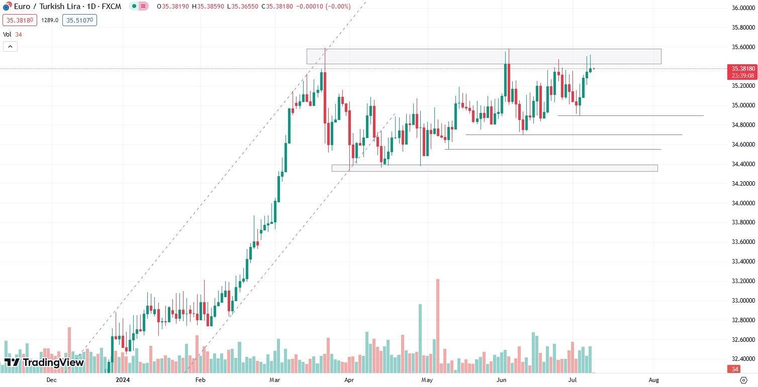 At the time of writing, the pair is trading at around 35.40, again testing the upper resistance level and struggling to muster the necessary strength for a decisive upward momentum. Although a brakethrough is certainly possible, it seems quite reasonable to expect a potential easing of the exchange rate in the coming months, especially if upcoming monthly CPI readings confirm a slowdown in the inflation trend (next CPI data is expected on August 5). Additionally, the influence of the EURO/USD pair and the recent strength of the Euro should not be underestimated.