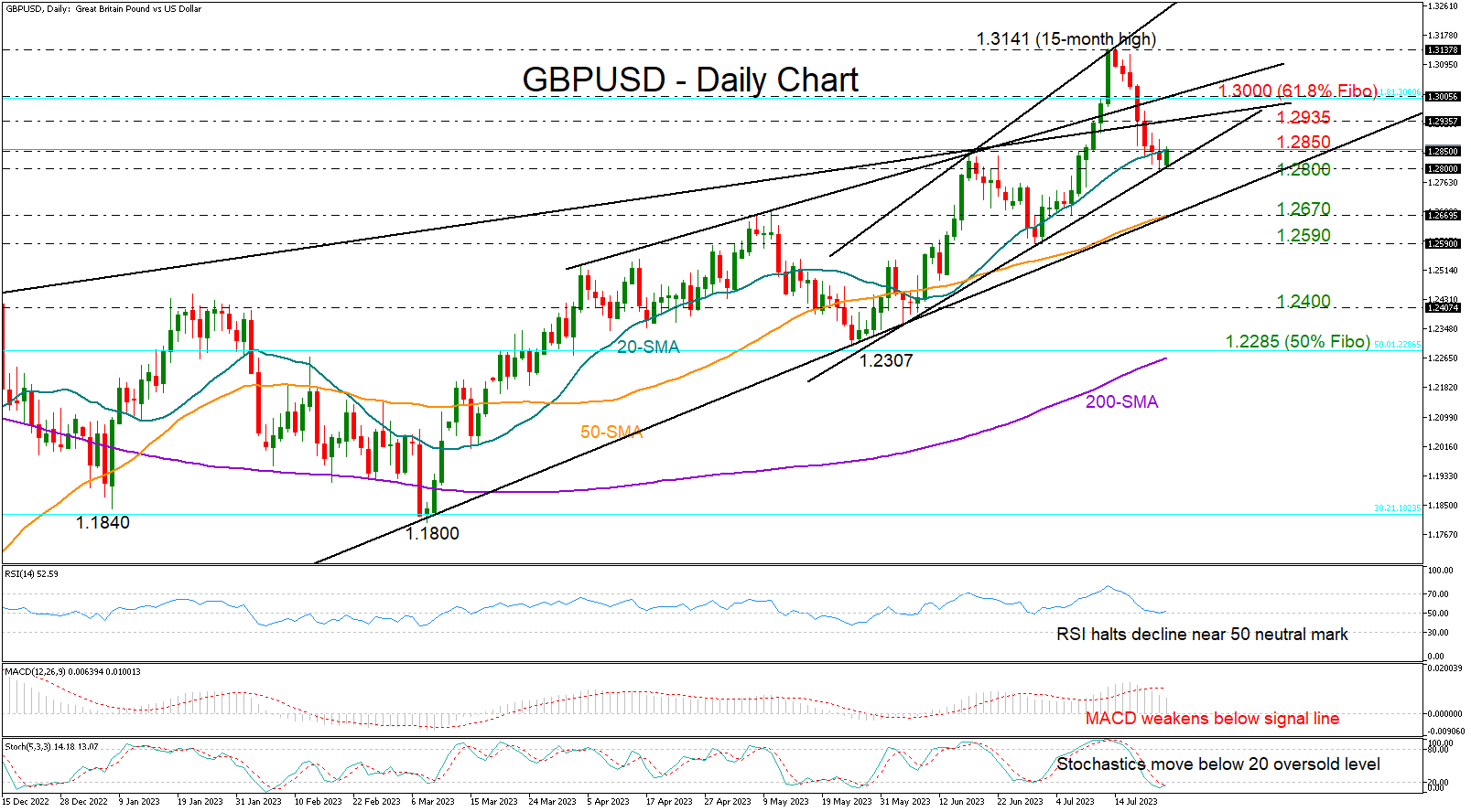 The bulls need the price to rise above 1.2850 and then break through the 1.2935-1.3000 zone, which includes two resistance lines and the 61.8% Fibonacci retracement of the 2021-2022 downtrend. A successful penetration of this boundary could clear the way towards July’s top of 1.3140, while higher, the uptrend could stretch as high as 1.3300, last seen in March 2022. This is where the tentative ascending line from June is located as well.