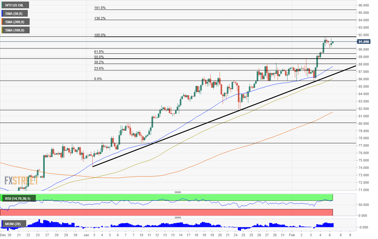 Where next for oil prices? After WTI Crude Oil surpassed the $90 level, a user has asked us this question. The short answer is that the trend remains to the upside, amid high global demand and just not enough supply, eyeing $91.80 (recent high) and then $94 and $95.30 (Fibonacci levels).