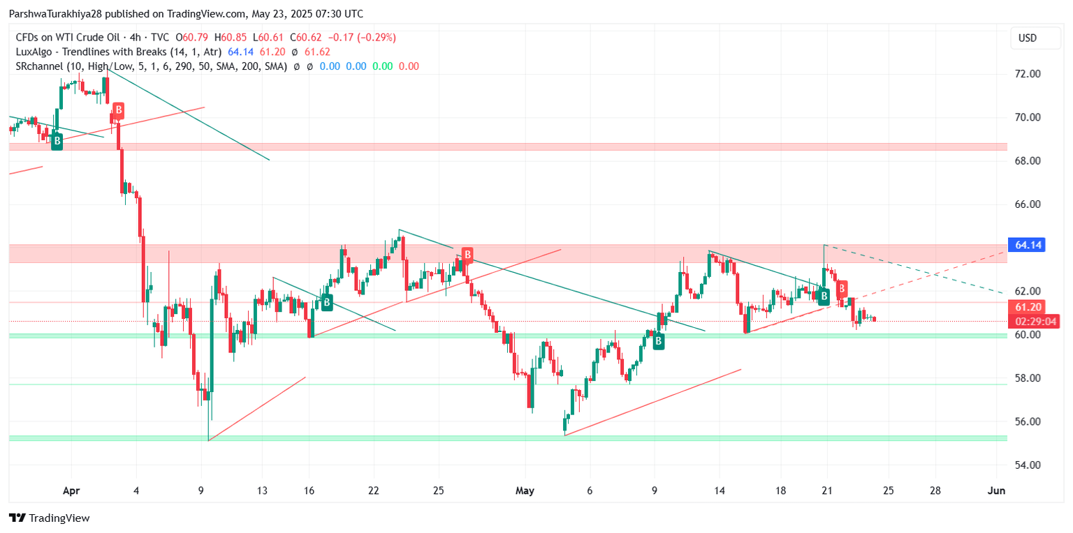WTI crude is currently trading at $60.71, having dropped below a key trendline support that guided its recovery earlier in May. The price has also dipped beneath both the 50-EMA at $61.44 and the 200-EMA at $61.36, signaling a shift in momentum. Immediate resistance is now seen around $61.14, with the price facing pressure from sellers looking to push toward $60.08.