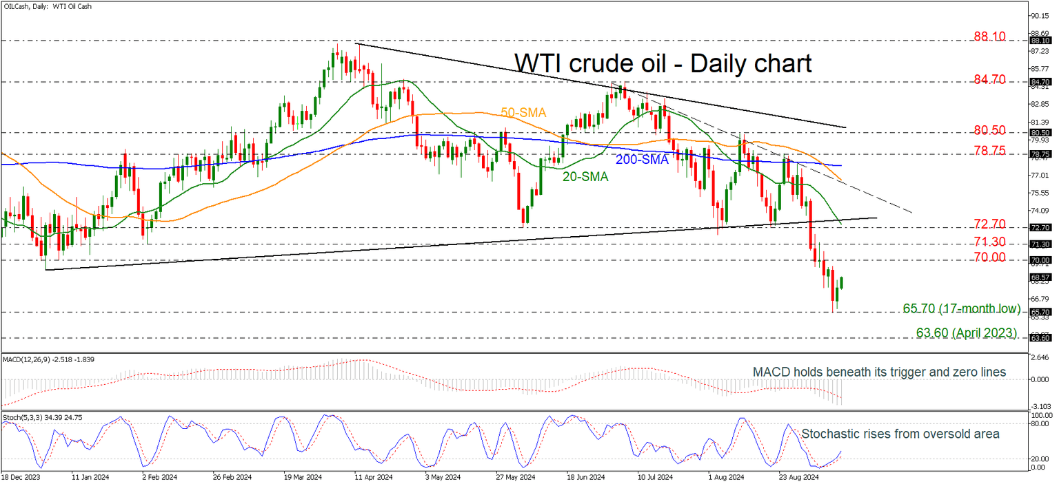 WTI crude oil has finally climbed higher from the 17-month low of 65.70 after the aggressive selling interest from the 78.75 resistance. Over the last three weeks, the commodity has lost more than 16%, switching the outlook to strongly bearish.
