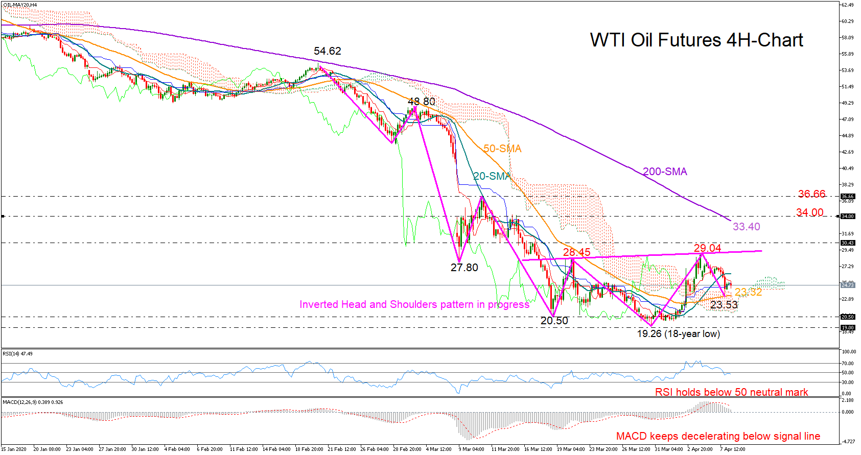 WTI oil futures (May delivery) appear to be forming an inverted head and shoulders pattern in the four-hour timeframe in a possible signal for a positive trend reversal. In the latest upturn, the price failed to overcome its previous high of 28.45 and reversed south to build the right shoulder.
