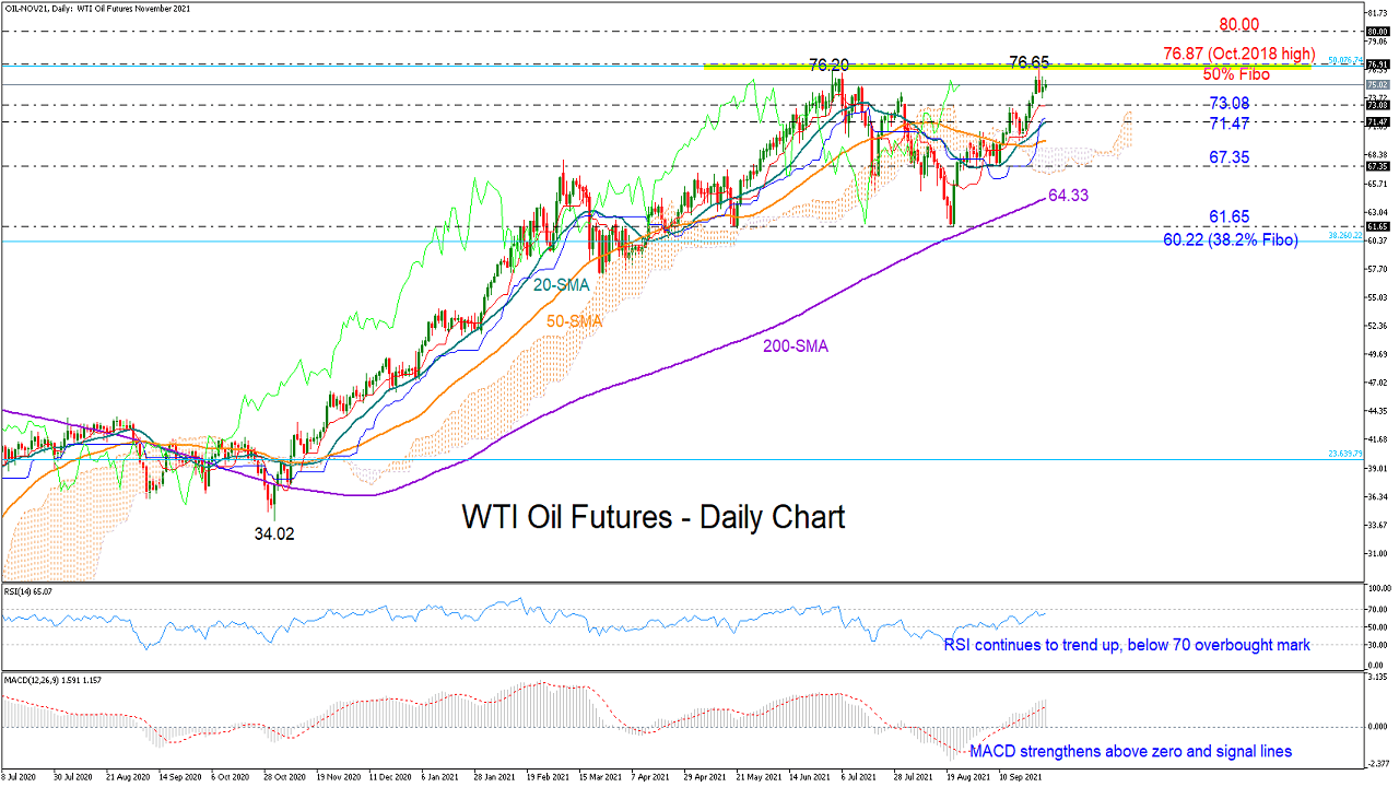 WTI oil futures (November delivery) are flirting again with the 2018 high of 76.87 thanks to the 20-day simple moving average (SMA), which has been assisting the commodity on the way up since the quick bounce near the 61.77 support area on August 23.