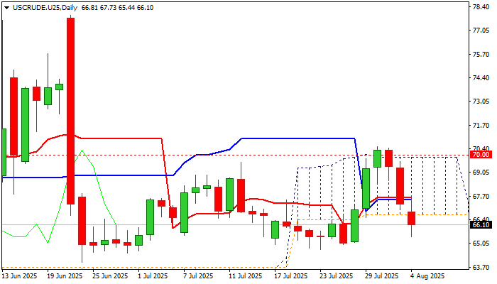Oil came under pressure after repeated upside failure at $70 zone (psychological/daily Ichimoku cloud top), with latest decision of OPEC+ to further boost production by 547K bpd in September adding pressure and so far offsetting support from concerns about impact from US tariffs on export from a number of their trading partners and threats of a massive sanctions on Russia and countries that buy Russian crude oil.