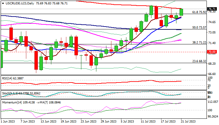 We look for initial bullish signal on weekly close above $75.92 (Fibo 61.8% of $83.51/$63.63 descend) which will need confirmation on eventual break through 200DMA ($76.74) and recent tops at $77.30, to signal bullish continuation and expose targets at $78.82 (Fibo 76.4%) and $80.00 (psychological) in extension.