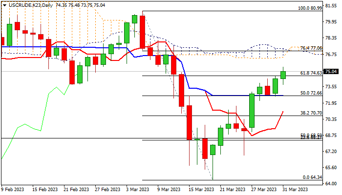 Fresh upside extension hit three-week high ($75.48), following break of pivotal Fibo resistance at $74.63 (61.8% of $80.99/$64.34 fall).