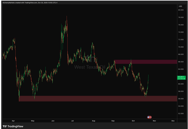 West Texas Intermediate (WTI) crude is surging this morning, up around 2.8% to trade just above US$61.90/bbl, following overnight reports that the U.S. administration has imposed sanctions on Russian oil majors Rosneft and Lukoil. The move — targeting producers with combined output exceeding 5 million barrels per day — has reignited concerns over global supply disruptions and injected a fresh dose of bullish sentiment into the oil market.