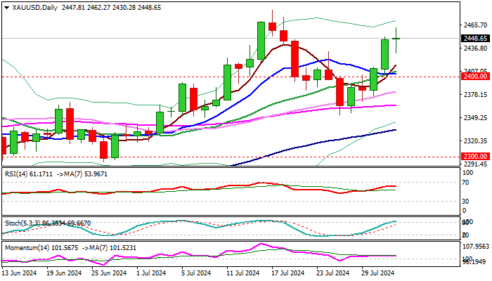 Gold price edged higher on Thursday and hit two-week high ($2462), but with warning that the latest upleg from $2353 may stall, as daily action was so far shaped in long-legged Doji.
