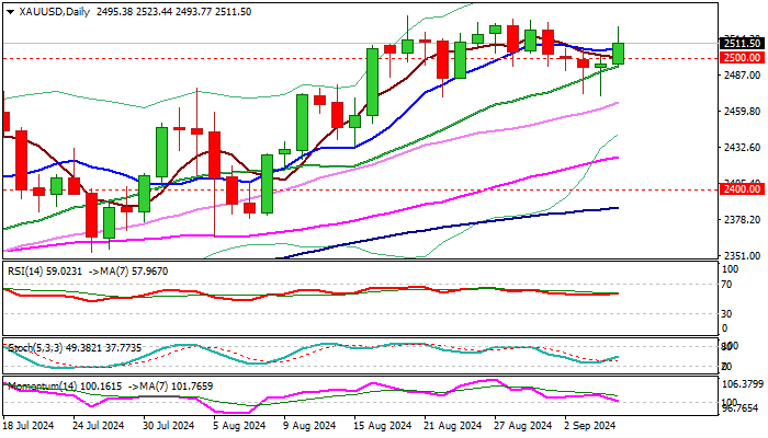 Improving technical picture on daily chart supports the notion, as long tails of daily candles in past two days, point to strong bids, with return above psychological $2500 level (also daily Tenkan-sen) and retracement of more than 76.4% of $2531/$2471 pullback, contributing to signals that corrective phase is likely over.