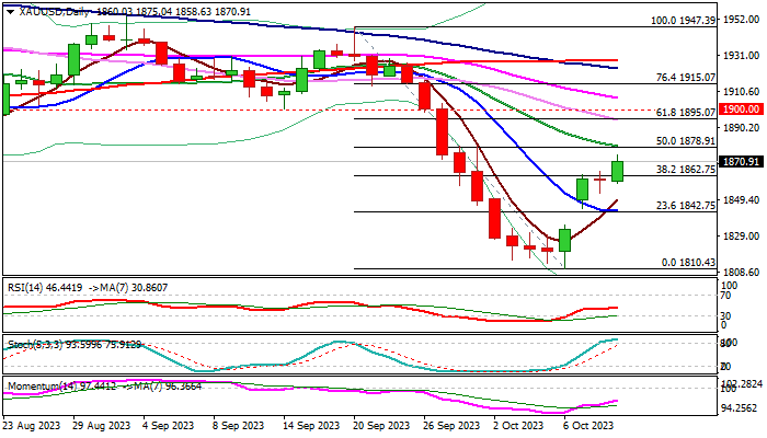 Situation on daily chart continues to improve as fresh gains broke above Fibo 38.2% of $1947/$1810 bear-leg at $1862 (though needs daily close above here to confirm the signal) and formation of 5/10DMA bull-cross.