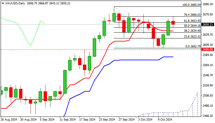 Near-term action faces solid support at $2636 (daily Tenkan-sen), holding above which to keep immediate bias with bulls and guard $2600 support.