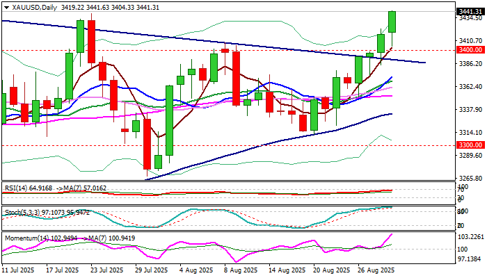 Fresh rally cracked target at $3438 (July 23 high), bringing in focus $3452 (June 16 peak) the last obstacle en route to $3500 (record high, posted on April 22).
