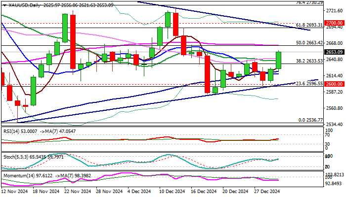 Gold gained nearly 1% in the first trading day in 2025, sending initial positive signal that recovery off $2582 (Dec 18/19 higher base) might be picking up.